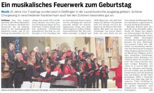 Das Ensemble „VOX TUSELINGA“ aus Deißlingen feiert sein 25 jahriges Bestehen. Das Konzert in der Laurentiuskirche in Deißlingen stand unter dem Motto “we love to sing”, die Happy Jazz Singers und Chorus Mundi gratulieren mit musikalischen Geburtstagsgeschenken.